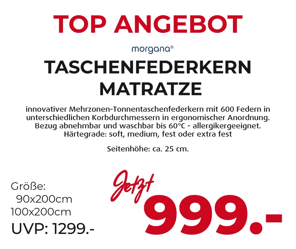 Erlebe höchsten Schlafkomfort mit der Taschenfederkern-Matratze LUGANO. Sie vereint dynamische Stützkraft mit sanftem Komfort.